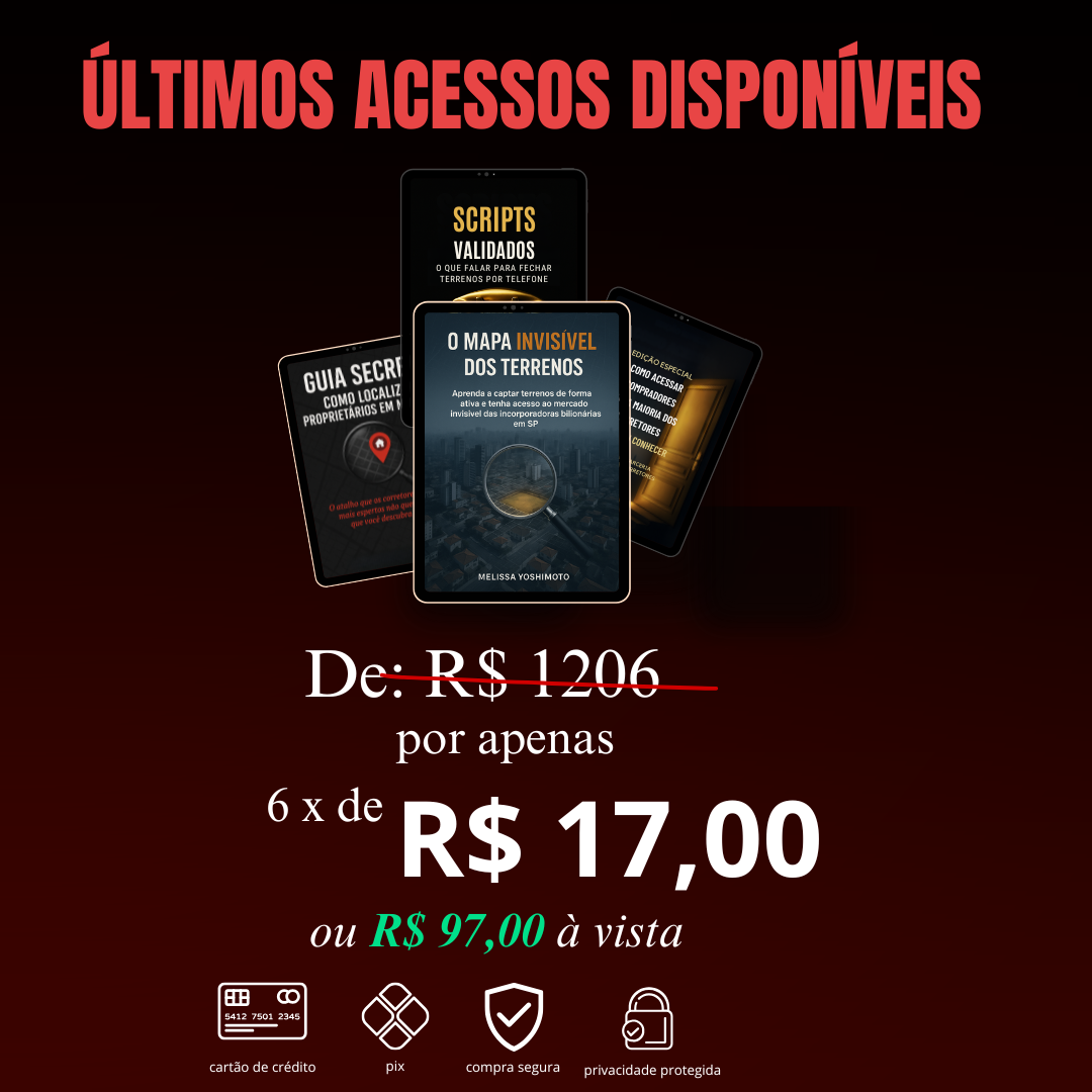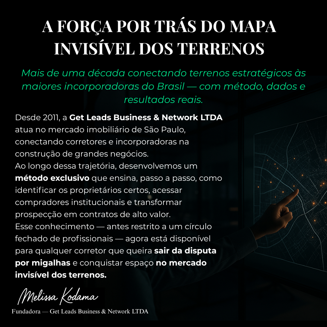 Não. O Mapa Invisível mostra o passo a passo, desde a identificação de terrenos até a abordagem estratégica com quem decide grandes aquisições.