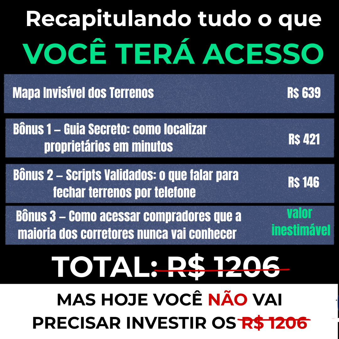 Todos os bônus exclusivos — Scripts Validados: o que falar para fechar terrenos por telefone, Guia Secreto: como localizar proprietários em minutos e Edição Especial: Como acessar compradores que a maioria dos corretores nunca vai conhecer — são liberados 7 dias após a compra, garantindo que apenas os alunos comprometidos tenham acesso a esse material estratégico.